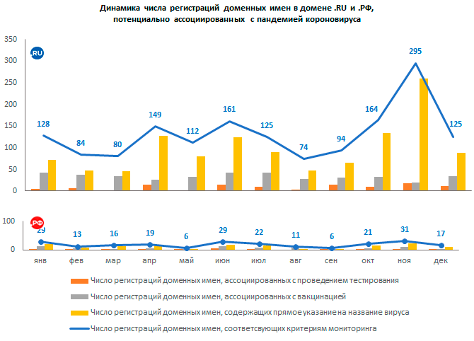 В целом за 2021 год в список доменных имен, содержащих слова «сorona», «covid», «pandemia», «ковид», «пандемия», «вакцина» и подобные, было добавлено 1591 домен в .RU и 203 в .РФ; всего за 2021 год в российских доменных зонах было зарегистрировано 1669 «коронадоменов».